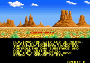 The third boss, Wolfkid, is a headswap of the second with more powerful attacks, but the head he’s been swapped for is a blatant ripoff of Jagi, the helmet-clad maniac brother of Kenshiro from Fist of the North Star. This leaps over the line of allusion straight into plagiarism, but Silent Dragon stayed… well, silent enough in public attention to avoid the lawyers. The fourth stage presents a mid-boss in the form of a fire-breathing armadillo who unsurprisingly rolls into you, also being evasive and frustrating to hit. The end of the fourth level sees the winged Animal Cupid return with a partner, a genetically-beefed green mutant with the also great name of Frankenman. This battle and even the armadillo are arguably a bit tougher than the final battle against Dr. Bio, who just floats about on a hover scooter and shoots you with a machine gun until you knock out his life bar and, surprise, he’s really a killer robot. Even in this form, he’s not too bad if you can step out of the way of his chainsaw arms, but his missiles may take a little more effort to avoid.