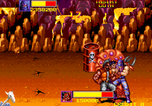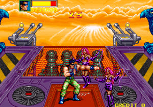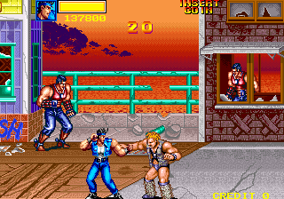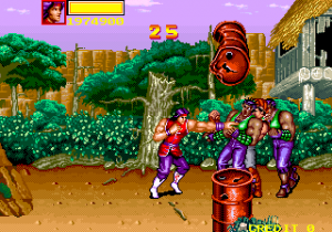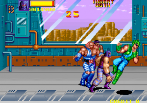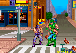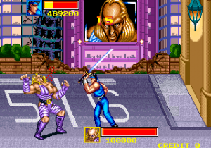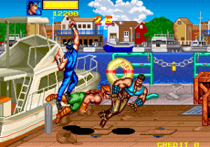 The plot involves a standard kidnapping, the least original justification for street-based carnage since 1987. The girl in question, Catherine, just so happens to be Joe’s girlfriend and Sonny’s sister, but she is now held captive by the nefarious Dr. Bio. The doc’s unique appearance can best be described as pirate Joker as played by Bea Arthur, so that’s a point in this game’s favor at the beginning. Your inevitable revenge rampage takes place over five levels, the first two of which are on your pretty standard city streets. First area’s a harbor, but it’s pretty straightforward from there to the third level, a big moving truck even shorter than the first two stages. Things get interesting at the fourth level, a jungle and a volcano with some freaky beasties, and the finale is a laboratory fortress where most of your continues will be spent. Aid comes in the form of street food that’s far cleaner than it should be and the East logo, which gives you enhanced power for several seconds. You can also grab a sword and what seems like a car battery. The latter’s pretty awkward as a weapon, but points for originality instead of the hoary old lead pipe. You can even find explosive barrels and randomly strewn dynamite connected to detonators to blow up enemies, though why anyone would leave that out in the open is up for pondering.