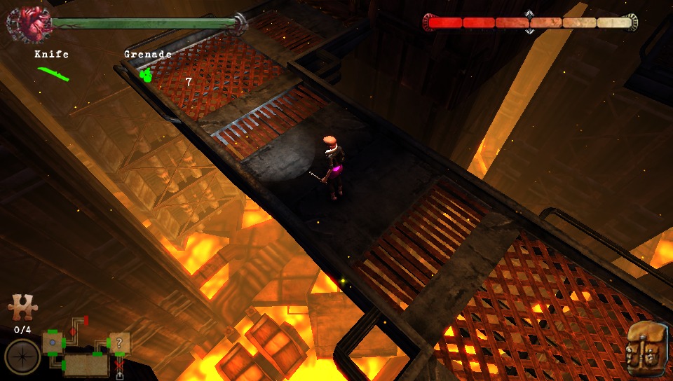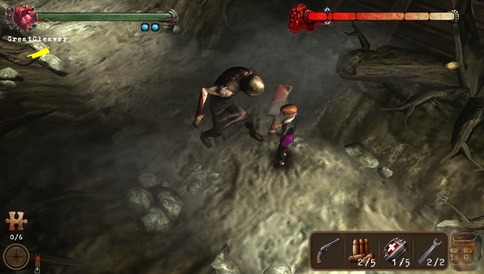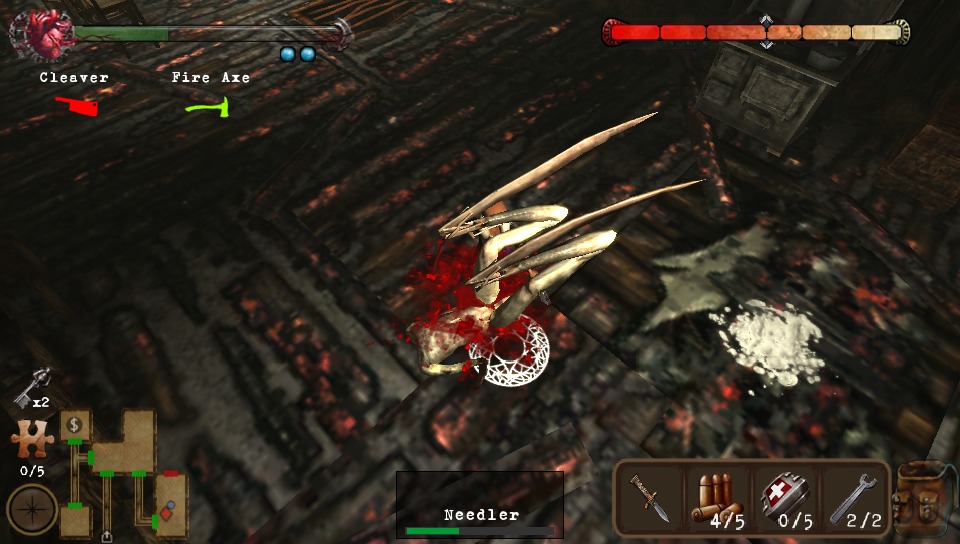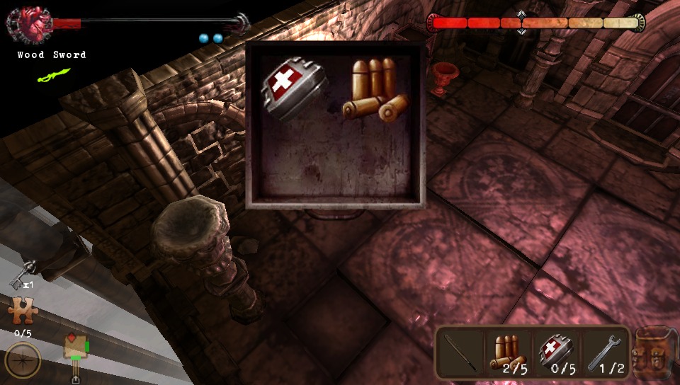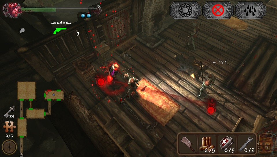 For as much as it wants to be a Silent Hill game, Book of Memories also doesn’t stray far from the Diablo mold. The player grind their way through seven dungeons, hacking, slashing, and dodging enemies, finding and buying loot, and leveling up. Each dungeon is elementally themed, fire, wood, ice, etc., and each dungeon is broken down into three zones. Zones are cleared by collecting a random amount of puzzle pieces, locked behind challenge waves of enemies, and a necessary hint. Once collected, they are arranged in some order like size or color, according to the level’s hint. The red lever beside the puzzle essentially works as an even bigger hint button that lessens the EXP reward with each use, if the level hint isn’t sufficient enough. While each zone is short, there’s no fast travel so hunting for a missing puzzle piece can turn annoying quickly.