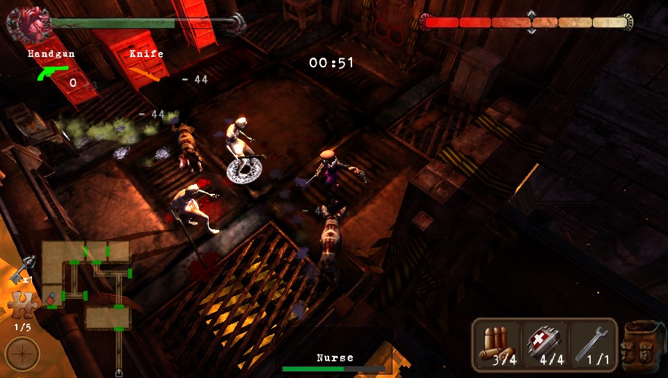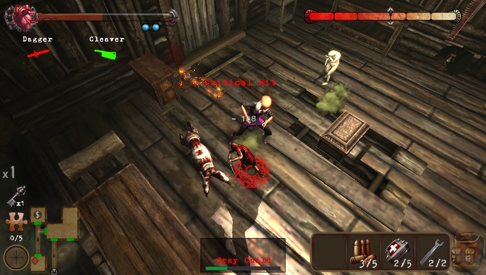 Combat has some small twists on the dungeon crawler format. Weapons have durability and break after extended use. While items exist to repair them, they are limited, and the player can only store a small amount of spare weapons, even after upgrading. Making use of the Vita’s many features seemed to be a goal for the game. The front touchscreen, much like with Minecraft on the Vita, gives easy access to health and repair items and the handy mini map. Karma abilities help gives some variety to the combat options, and those abilities change depending on your alignment. Unfortunately, these abilities use the Vita’s cumbersome back touchscreen. It’s frustrating to hold two fingers to create a line of damage or steal health from enemies while also trying to do anything else with the front of the system. Enemies are a who’s who of evil symbolic folks from the games, with at least one monster from each previous entry present. Sometimes, modifiers play a role to make them more dangerous; dogs that explode when they die or combustible nurses that set the player on fire.