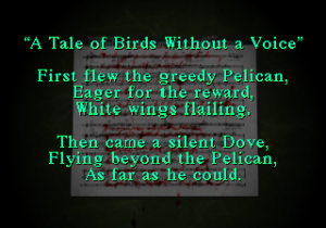 And yet, the game does occasionally get lost in its obfuscation. There are multiple endings (one of which pays homage to the ending of the movie Jacob’s Ladder), but no indication of where or how to undertake the subquests to get the good ones. It’s a short game, like many of its kind, but it’s annoying to find that you’ve irreversibly missed an important point without any clear signal. Still, it gives quite a bit of replay value, and there’s much goofiness to be found in the secret fifth “UFO” ending, which gives some absurd levity to the otherwise brutal proceedings.
