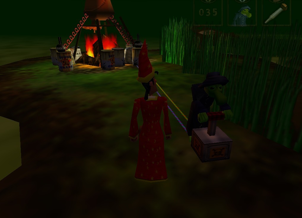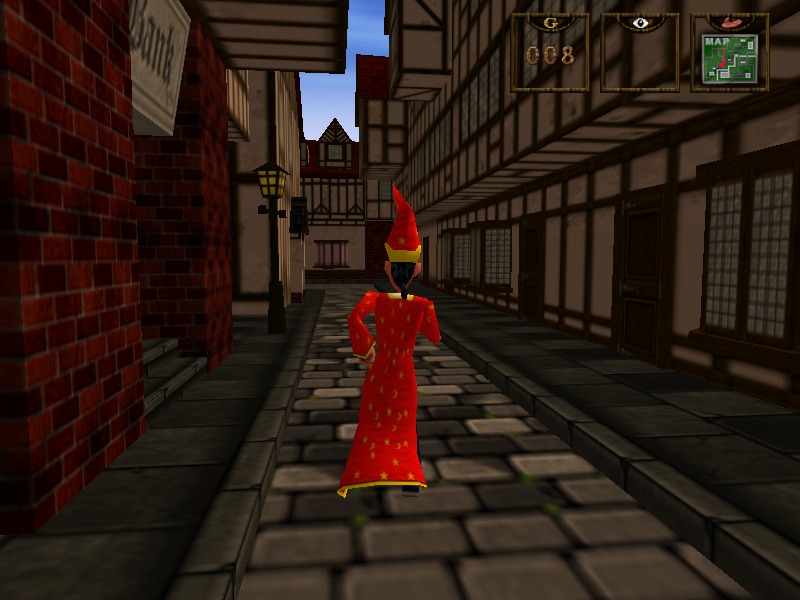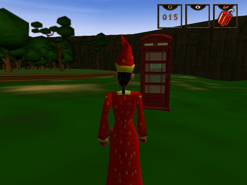The world design suffers from the same problem as many early 3D games – it’s just simply way too big and empty, and it takes forever to traverse, even when you’re running. (Later in the game you can transport around a map via a Doctor Who-style telephone booth, but even that’s limited.) It feels padded, tedious, and overly long, because it takes forever to go anywhere or do anything. The world is bright and colorful, but that’s about the best thing to say about it.