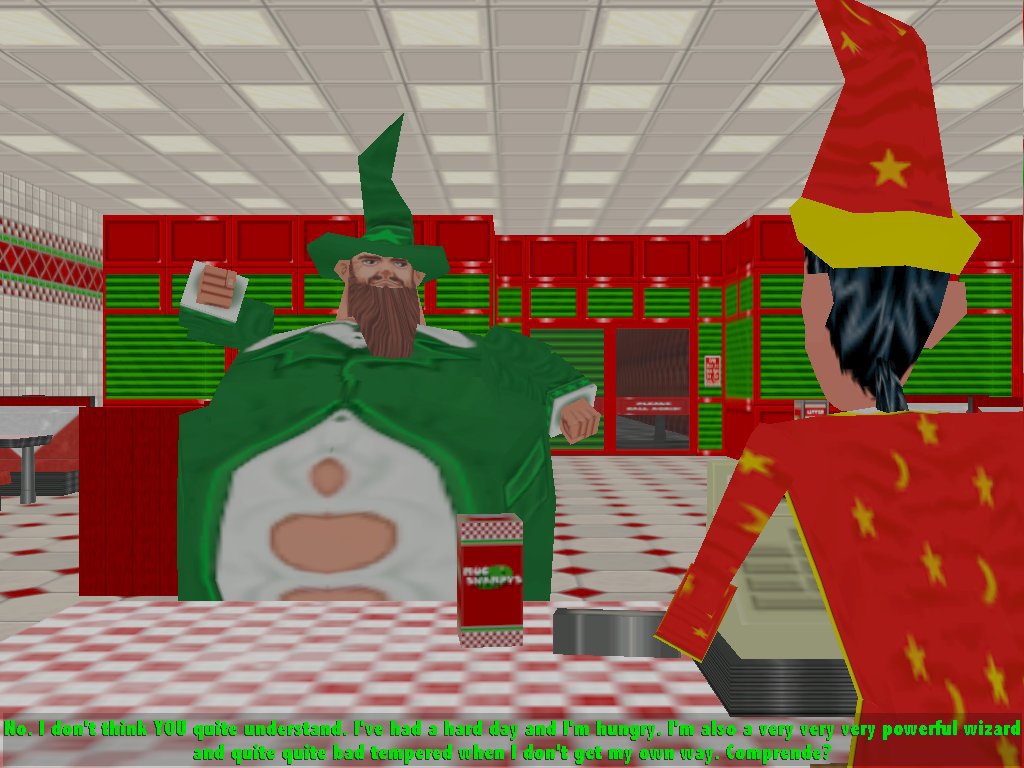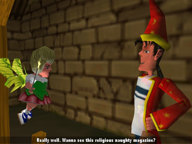 The writing and sense of humor, as well as the voice acting, is generally on par with at least the second game. There are a number of returning characters, including the Swampling, who’s now become an eco-terrorist after his homeland is threatened. The woodworm, the role players, Goldilocks, and the demons also make appearances again, as well as Sordid’s apprentice Runt, who only had a minor role in the second game. The second half of the adventure involves assembling a group of four legendary warriors: the buxom, scantily clad lady warrior Melissa Leg, the somewhat dead Jar Nin, the largely daft Coneman the Barabrain, and the transmogrified Prince Brave, who’s stuck as frog. The unfortunate circumstance is that Simon had pissed off nearly all of these people earlier in his journey, which is naturally a bit awkward for him. Simon also has his own fairy godmother, although she’s not particularly funny and mostly acts as a tutorial guide.