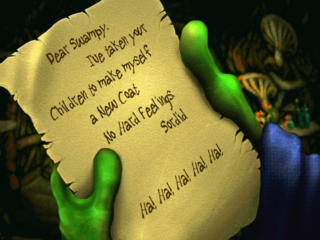 The rest of the features are pretty thin. There are four scrambled puzzles, two using FMV featuring Gerald and Max (presumably) and Swampy, the other two from The Feeble Files. There are also a few variations of solitaire with cards illustrated with various Simon characters. Finally, there’s DIMP, or Demon In My Pocket, a Tamagotchi-style virtual pet application where you beat and torture a demon to make it happy. None of the titles on here are really anything more than vague diversions and are mostly worthless beyond their novelty value.