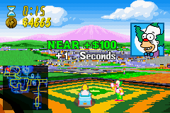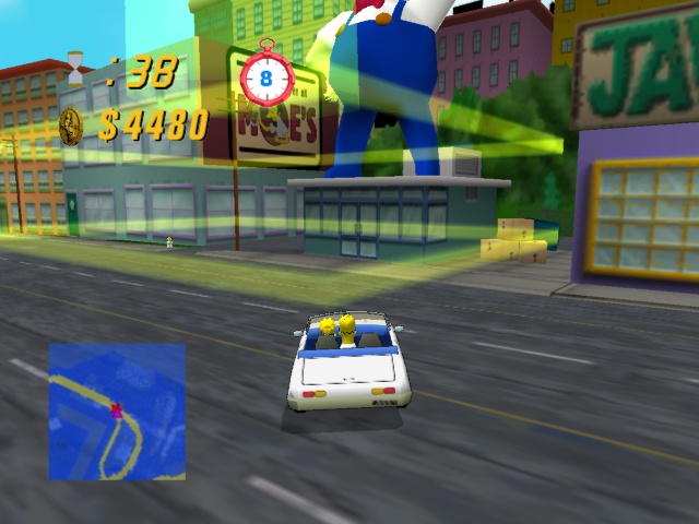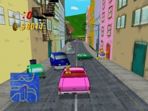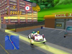Once selecting a character from The Simpson’s universe (in which there are seventeen total, most having to be unlocked. They include Homer, Marge, Bart, Apu, Krusty the Clown, and others), you are immediately thrown into Springfield to go make crazy amounts of money by picking up passengers and bringing them to their destinations before time runs out. The game is very faithful to its source material, as the visuals appear as though you’re watching a three dimensional version of the show with actual landmarks from taken from episodes. From a technical standpoint, it’s close to it’s Crazy Taxi counterpoint despite the occasional clipping and dipping framerate. The one thing this game really excels at is it’s sound department, as all the characters use their original voice actors/actresses for this game. A lot of the lines are taken straight from the show, and each person you pick up depending on who you choose as a driver is character specific. Even the music is taken from the show.