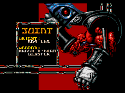 The presentation is excellent, though. The graphics are great, with smooth scrolling and awesome use of color. There is a strong influence of comic books of the time, and all levels have a bio-mechanical feel that mixes cold steel and stone with flesh, bones and muscles, reminiscent of things like R-Type and HR Giger’s works while remaining quite distinct and original. Some settings are more surreal than others – never before (and probably after) has Mars been pictured as a world of lava rivers, giant crystals, steam pipes and robotic bipedal frogs (!?). The few bosses are also appropriately fleshy and disturbing (except for the last one) – the enemy mutants however are less original, almost all falling under the “squat humanoid with big guns” template. All art, including box art, is mostly the work of artist James Ryman, who went on to make illustrations for Magic: The Gathering and the World of Warcraft card game.