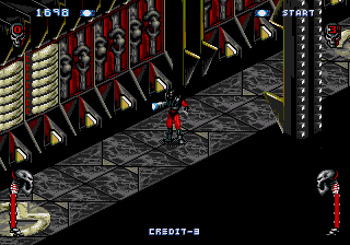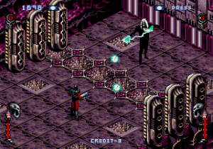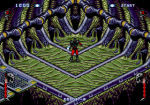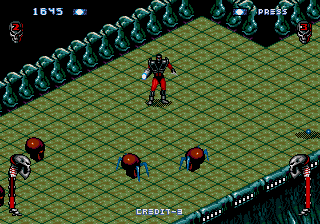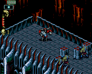 Skeleton Krew is a run-n-gun with an isometric perspective where you have to shoot at everything all the time, and the only weapons are the standard blaster, with infinite bullets, and grenades to throw at the enemies who are too low on the ground, also limitless. There are no other upgrades, in fact there is no other extra stuff period, save for extra lives and money (or “Nu-Bucks” as the manual calls them) lying around, whose only purpose is to let the Krew gain a new life every 10,000 points. The money, however, can also be overlooked since the game is not exactly long – six levels (five in the Amiga version if you don’t count the final boss) with a password system, and the characters have three continues with three lives each, so reaching the end is just a matter of time.