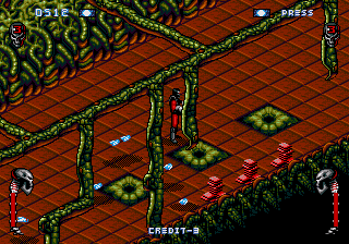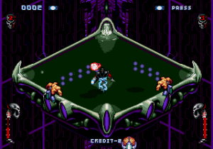 The degree of interactivity with environments is also very low: at the beginning of the first level in the Mega Drive version there are some columns that can be pushed past by shooting on them, but nothing ever is made of this, and the only other thing that can be done is to (what else?) shoot once a stone slab to use it as a makeshift bridge. Not that anything other than “killing everything” is really needed – even the missions that have a clear objective, that is, not just surviving until the end, need the Krew just to destroy some static generators or something like that, not exactly exciting stuff. The Amiga versions do not even have real bosses at the end of most levels, these stages just end right there, and then the password for the next one is given.