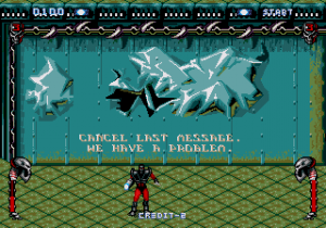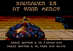 Speaking of end bosses, something needs to be said about the final confrontation from the Mega Drive version. At the end of the last level, DEAD headquarters (DEADquarters?), which is missing from the Amiga version, there is an ominous, empty corridor that leads directly to Kadaver, who is… just some guy in a black suit standing still, whose only attack is to conjure blue energy balls. He is, however protected, by force fields that must be removed by shooting at the generators on the walls of the room. When the fields are deactivated Kadaver starts teleporting around the room, with a pretty cool phasing effect, still just shooting those slow spheres. He’s a pushover, and he comically gets blasted through the wall, leaving a human-shaped hole a la Looney Tunes, but just when everything seems to be over, his second form bursts through the background for the last battle. This form wants to be grotesque and unsettling, but is only goofy-looking, and not that hard to defeat. After this, the game asks us a “moral” question, whether we want to murder the bad guy right then and there, or spare his life. Since we did nothing else but shooting at everything up to that point, the answer is obvious, and this part feels forced and edgy for the sake of it, but in line with the cynical attitude of the Dark Age of entertainment products.