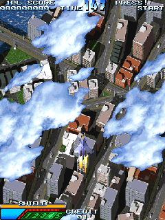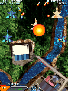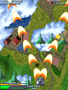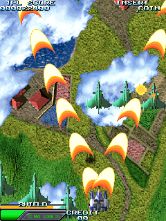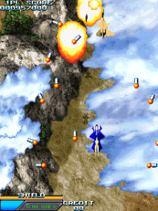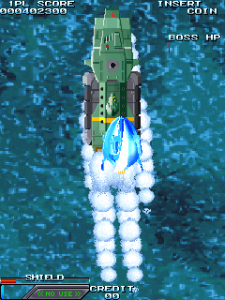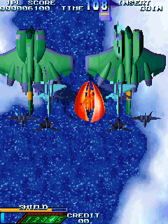 The most outwardly noticeable issue with Skull Fang is that it ditches the nice sprite work of the previous games and replaces it with badly rendered CGI ships, which makes the game look terribly dated compared to the older titles in the series, or even any other vertical shooter made in the mid-90s. It uses some scaling effects to make the field feel more three-dimensional, but it looks really cheesy compared to other shooters from around the same time, like Taito’s RayForce or Raizing’s Soukyuugurentai. The game runs on Data East’s MLC system, their most powerful arcade hardware.