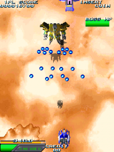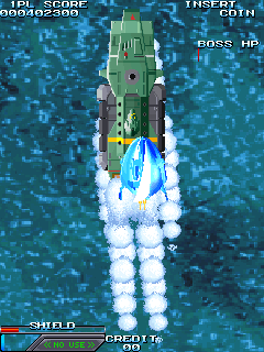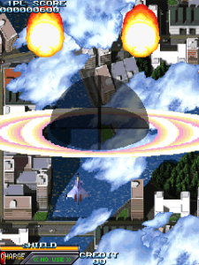 The boss fights introduce an interesting mechanic. If the boss goes off the screen, a window pops up called “Skyeyes” which shows you where and how far away it is. The bosses can also attack you from off of the screen and fly behind, over, and above you, with a target on your ship indicating their positions. If you’re playing in Chase mode, you can alter your throttle in order to catch up with them. Again, it’s another innovative idea, but in practical purposes, it’s rather frustrating to have the boss constantly floating in and out of your view. Battles tend to drag on, too, then time out if you fail to beat them under the limit. Obviously it seems like the developers were aware of this in letting you choose the “Auto” mode, which makes these quicker.
