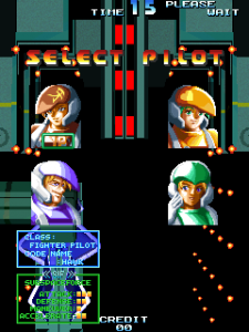After selecting a mode, you pick your fighter. The different aircraft you can choose from are part of various military branches, including the Space Force. Next, you select your pilot, who are divided evenly between “Fighter” and “Bomber” classes. The Fighter classes have the ability to roll. By default, this triggers a shield that lasts for a few seconds before it needs to be charged up again. However, by inputting various directional commands on the joystick and then hitting the roll button, you can pull off other maneuvers, including a more powerful shield attack, an air brake, and the ability to do a loop-to-loop and face downwards for a few seconds. This allows you to shoot enemies coming from the bottom of the screen. It’s a neat idea, but a clumsily implemented one – if you get the motion wrong or the game doesn’t pick up on it, you’ll activate the default shield and need to wait a very long time before you can try it again.