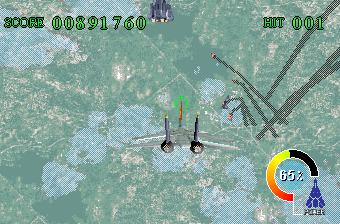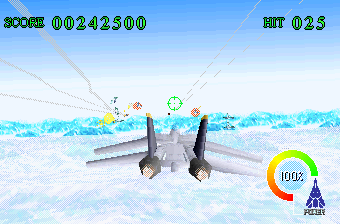 You only get one life per credit, although now your plane has a lifebar and can absorb a fair amount of damage. Unfortunately the music is the worst kind of generic butt rock, all done with very cheesy synth, though the composers tossed in a (rather limp) arrangement of the After Burner theme song.