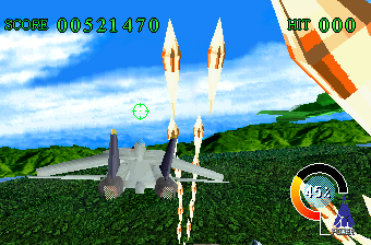 Beyond the arcade release, Sky Target was also ported to the Saturn and Windows PCs. The Windows version is a faithful port, but the Saturn version (pictured) isn’t quite as good looking. The Saturn version also has a “Ranking Mode”, which lets you replay any missions you’ve beaten in “Arcade Mode” in order to get high scores.