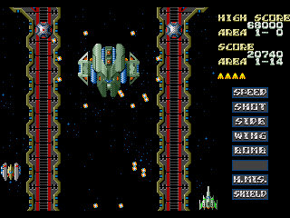 The game’s main gimmick is its power-up bar, which was obviously inspired by Konami’s Gradius (released the previous year in 1985) but works slightly differently. Destroyed enemies will drop capsules, which will then advance the power-up bar by one square. Using these, you can pick whichever weapon or power-up you want, though most of the stronger items are near the end of the bar, requiring that you grab more capsules. It also inherits an element from Data East’s B-Wings, also released in 1985 – whenever you change weapons, your ship also changes shape, changing your hitbox and often making you a bigger target for enemy fire.