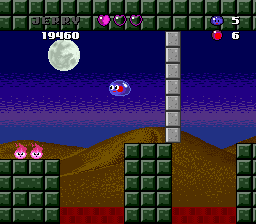 Much like the Mario series, the kingdom seems to stretch a myriad of biospheres. The game leads through many stock level themes with a beginning grassland leading to an urban area, desert palace, the aformentioned moon, the arctic, a beach, a dark castle, and more. In between each stage is a city, town, or village to head through, chatting with townsfolk and earning 1ups from the helpful but mysterious elderly mentor watching out for the cursed prince. The populated locales do spread to strange areas like a mountain villa, a collection of igloos, a cloudy heavens inhabited by angels, even a few people living inside the belly of a whale. They serve as breathers with plenty of tips, flavor text, and free extra men– er, slimes. The Magician’s controlled army are quite cutesy, with walking mice and googly-eyed boulders, living flames, penguins patrolling the landscape en masse. A few out-there foes stand guard, like unfrozen cavemen, naked fire-breathers, spatula-throwing chefs, to even a constellation as a boss.