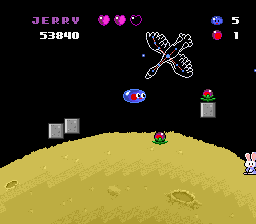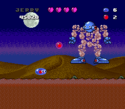 As an early SNES title, it isn’t far removed from the platforming faire of the NES days. The blue slimeball Jerry heads left to right using the standard 2-button attack/run and jump methods perfected with Super Mario Bros. years before. Aside from the music and sound effects, there is little push to take much advantage of the 16-bit system, lacking transparency effects for the underwater segments. The only real attempt to showcase the new console’s visual capabilities was the Mode 7 scrolling on the moon, though many first gen SNES games abused that built-in graphic setting. Luckily, a certain level of charm in the blocky build of the colorful sprites holds up today better than during its debut.
