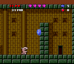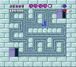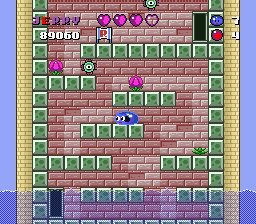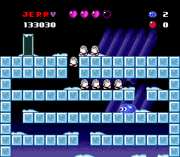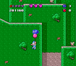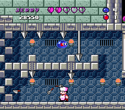 Playing as a slime ball brings a few spins to the platforming mix. Since Jerry has no limbs, he has to find other means of offense. He can stretch up or squished down around or on enemies to knock them away, or fling balls or other power ups he collects and stores in his jelly mass. His slurping goo form can also climb walls and on ceilings or slip through pipes to traverse levels or save his slimy bacon from plummeting into a pit. He can collect items in flowers throughout the levels, gathering multiple balls as ammo, a steel ball that weighs Jerry down but can be flung over and over again, a hi-jump booster, or a seed he can plant for a beanstalk to climb. Each stage has posts that spell out J-E-R-R-Y, which grant two extra lives to Jerry Bean if he touches them all and serve as checkpoints.