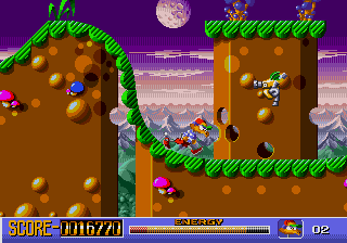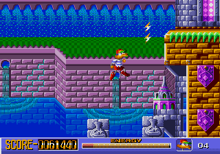 Socket in general has a low level of challenge, owing to the many power-ups you can find, the number of continues build up the more points you get, and the overall pleasantness of the controls. Trying to run up hills can be a bit sluggish, since it’s sometimes unclear how you’re meant to get enough momentum, but moving and jumping around is consistently dependable. That said, the lack of escalating challenge until the final levels means that there’s no major highs or lows, making the adventure feel flat and forgettable at times.