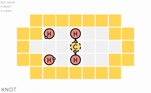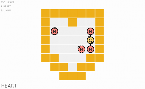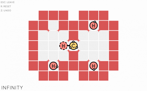 The game throws you into a barely populated board with various puzzles you can unlock by beating each challenge. The goal in all of them is to move your given molecule on the plain field, navigate the walls and obstacles, and connect all open molecules on board, creating a chemical compound and learning more about it as a reward. The board is divided into multiple sections with different themed challenges as well, all informed by a unifying color. For example, one set of puzzles requires that you create two separate connecting molecule chains with helium particles, which can’t connect to anything. Another introduces multiple part molecule clusters with molecules that can connect up to four other molecules. There’s a total of 105 puzzles to solve (not counting bonus puzzles), and they get maddeningly complex the further you get.
