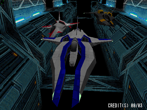 The graphics look fantastic, better than any PlayStation or Nintendo 64 game from back then, running at a higher resolution with some nice graphical effects, and very smoothly too. It runs on the Konami GTI board, which also powered Gradius IV. The music is thumping techno, and is mostly forgettable.