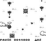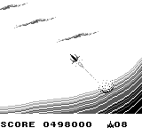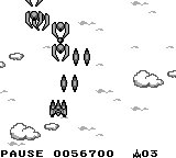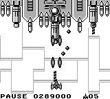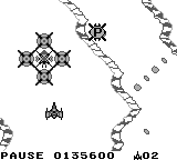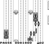 The visual quality in SolarStriker isn’t that bad. It’s not the best that the Game Boy has to offer, but it was an appreciable attempt for an early GB title. The game’s stages follow a logical progression of scenery. You first start off in a starfield in space. In the second stage, you enter the atmosphere of the enemy’s home planet. The next stage has you flying above a city highway, complete with individual lanes and everything. And the later stages progress like so. So while it isn’t as flashy as other shooters to come after it (and before for that matter), one can appreciate the intelligent progression of surroundings as subsequent areas are reached.