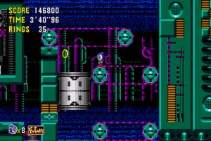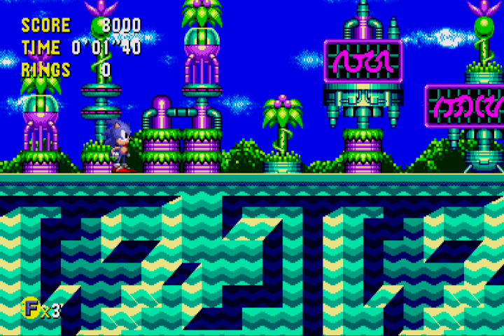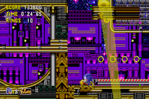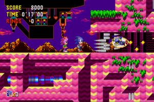 The central conceit of Sonic CD, though, is time travel. Through each stage are posts that read “Past” and “Future”. If you can build up enough speed (a la the Delorean in Back to the Future) and keep it long enough, then you’ll jump to a different time period. While the core level is basically the same in every era, it uses different tilesets and music, plus some parts of the layout are changed, though usually not drastically.