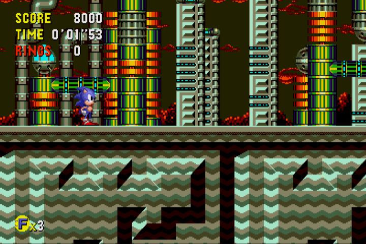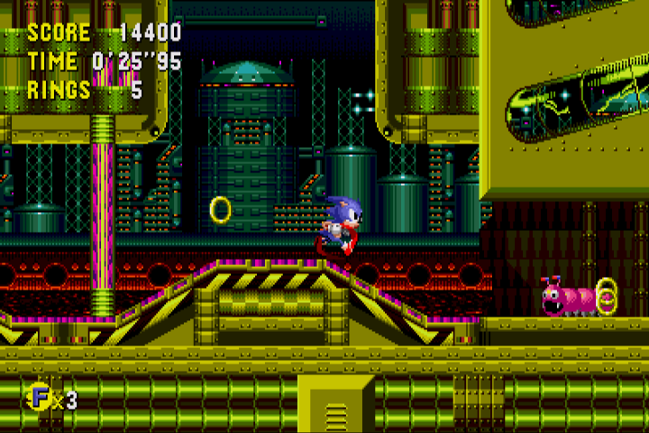 There are four variations of most levels: Past, Present, Bad Future, and Good Future. You start a level in the Present, and by default, if you go to the Future, you’ll end up in the Bad Future, where the level is polluted and wrecked by Robotnik’s machinations. In order to fix things for the future generation, you need to jump to the Past version, hunt down Robotnik’s enemy generation machine, and destroy it. Even if you’re not in the Past time period, you can still find remnants of it in other time periods, so you know roughly where you look. Once you’ve busted it, if you jump forward in time, you’ll end up in the Good Future instead, which is free of decay and might brighter than its Bad counterpart. Like the original Sonic, each Zone has three Acts, though the final one is fairly short and primarily consists of the boss battle. There are only Good and Bad Future versions of the third Act, depending on whether you destroyed the machine in the previous two Zones. That means, technically, across all seven Zones, there are 70 levels. ((7 x 2 x 4) + ( 7 x 2))