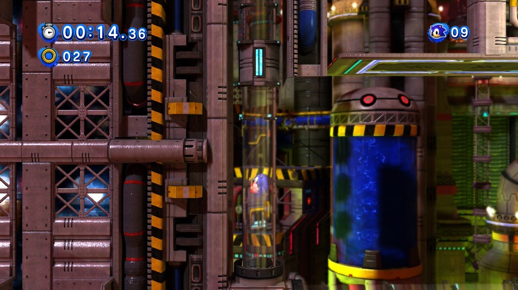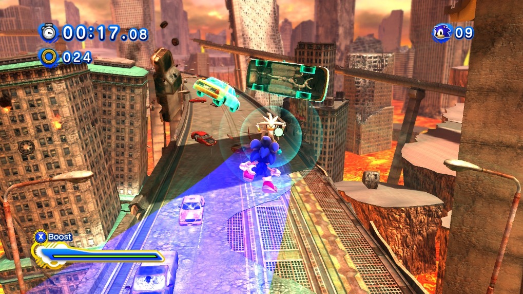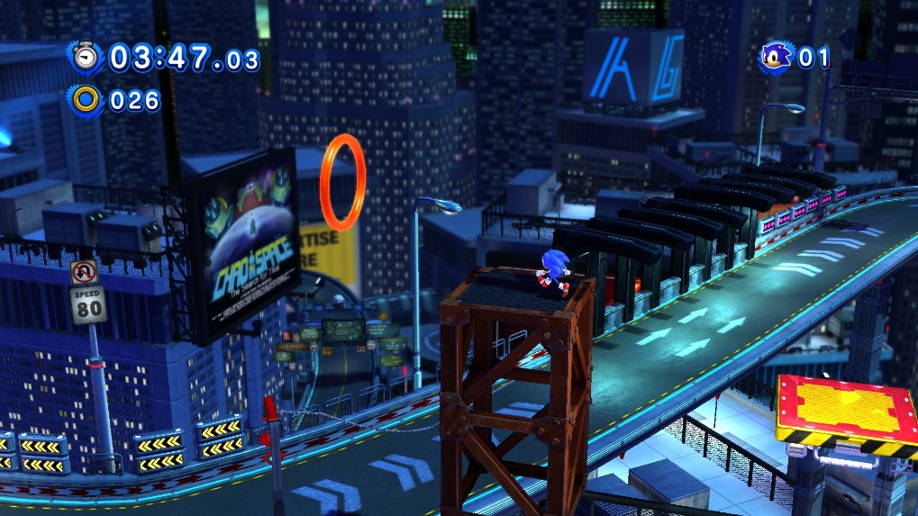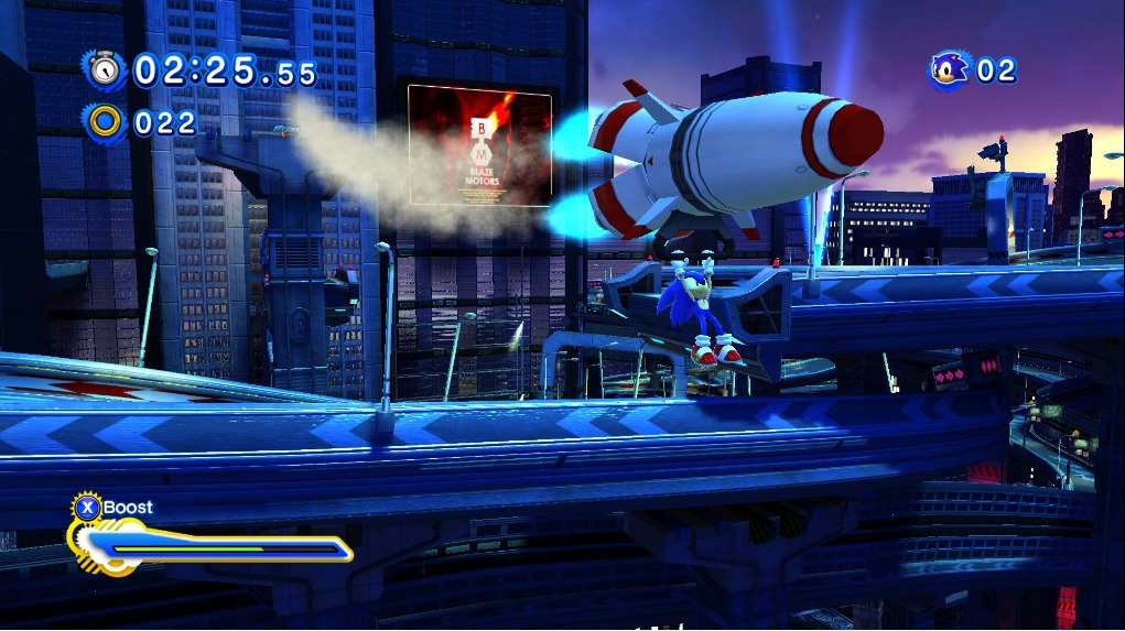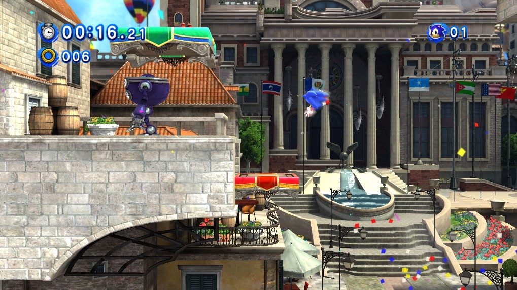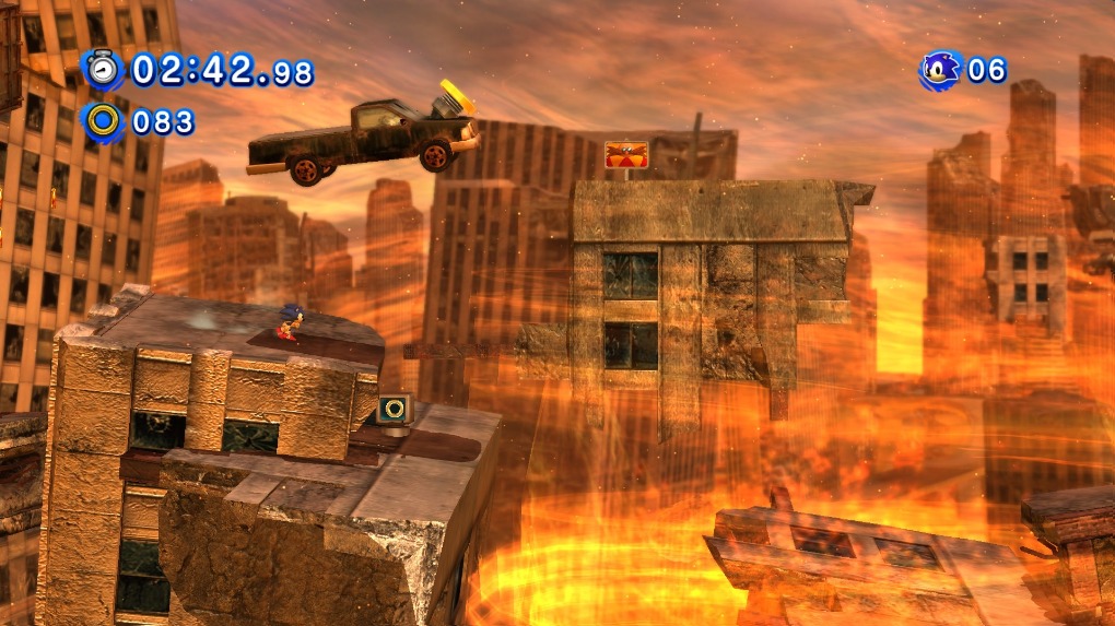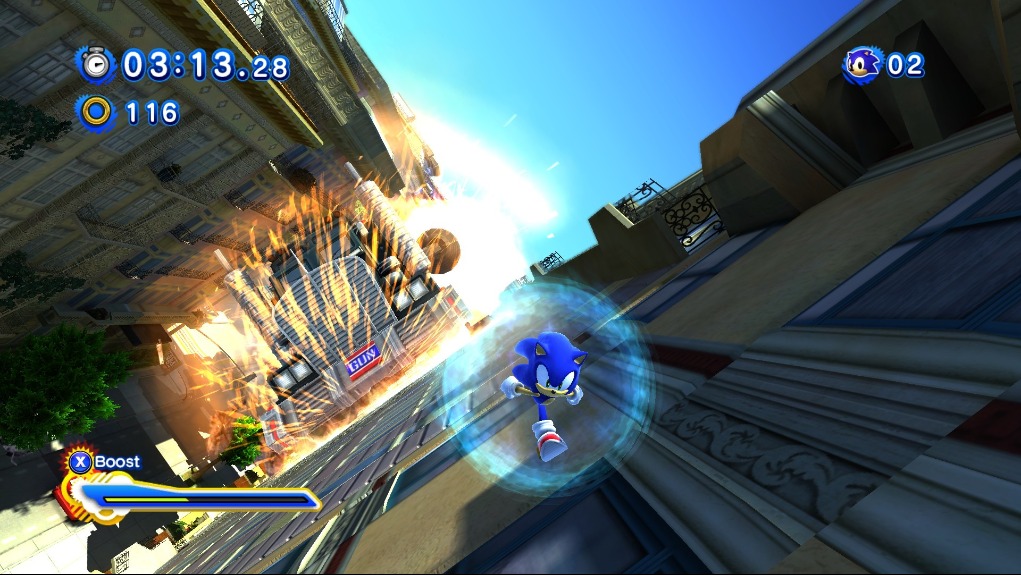 Far from just coasting on nostalgia, the levels are filled to the brim with creative expansions on what made these levels so memorable to begin with. Everyone loves City Escape, the opening level to Sonic Adventure 2, which begins with Sonic snowboarding – minus the snow – down the streets of Central City, and concludes with a brief chase from a GUN Military Truck. It’s a fun set piece to end the level, but all you really need to do to escape is hold ‘down’ for fifteen seconds. In Sonic Generations, the same truck frequently menaces Classic Sonic in Act One, destroying platforms, deploying enemies, and loudly hunting him throughout, and in Act Two, the chase sequence has been greatly extended, and the truck is now armed with three extendable arms wielding circular sawblades that you have to avoid. And when Sonic escapes by running up a wall? The truck reveals that it’s also been outfitted with rocket thrusters, which allow it to fly up the wall and continue to chase you. This is just one example, but the game is packed with imaginative additions like this.