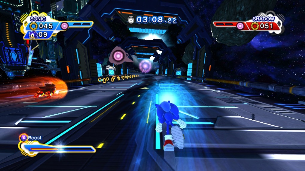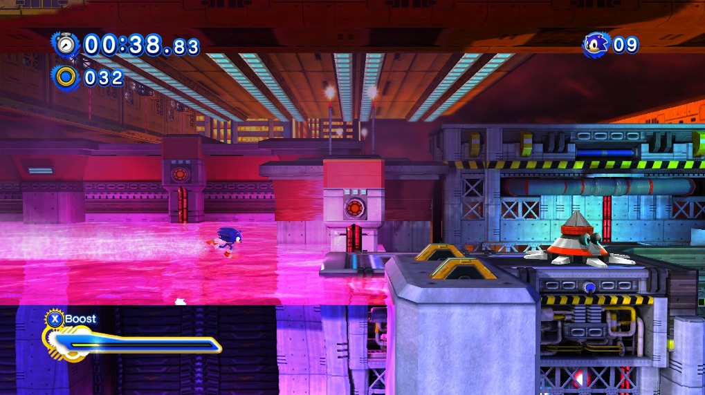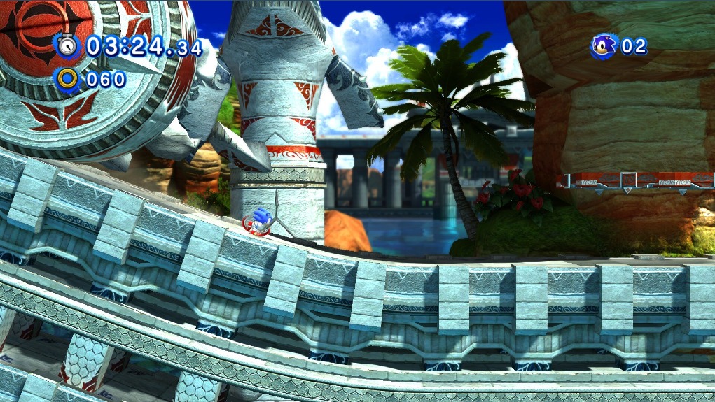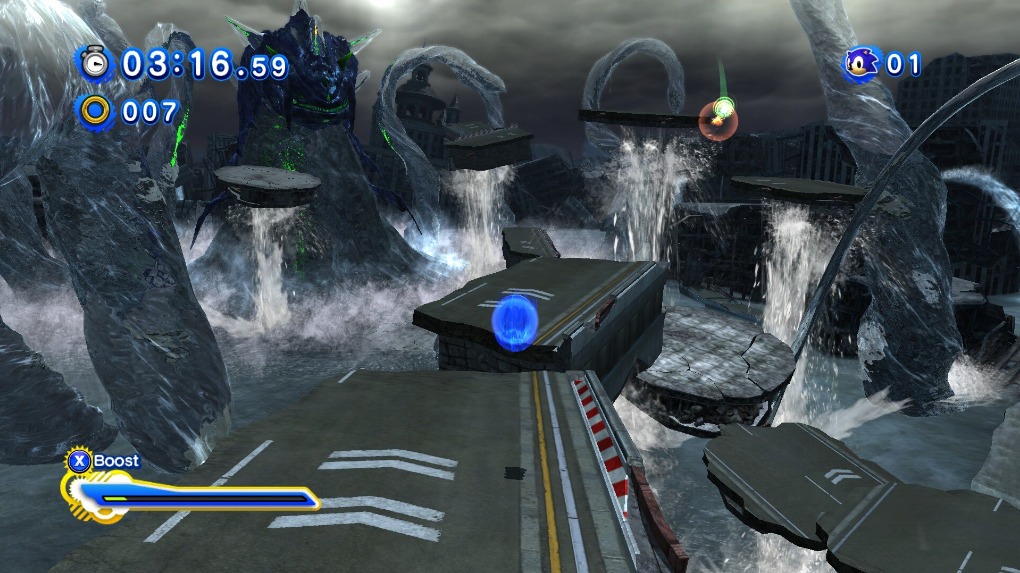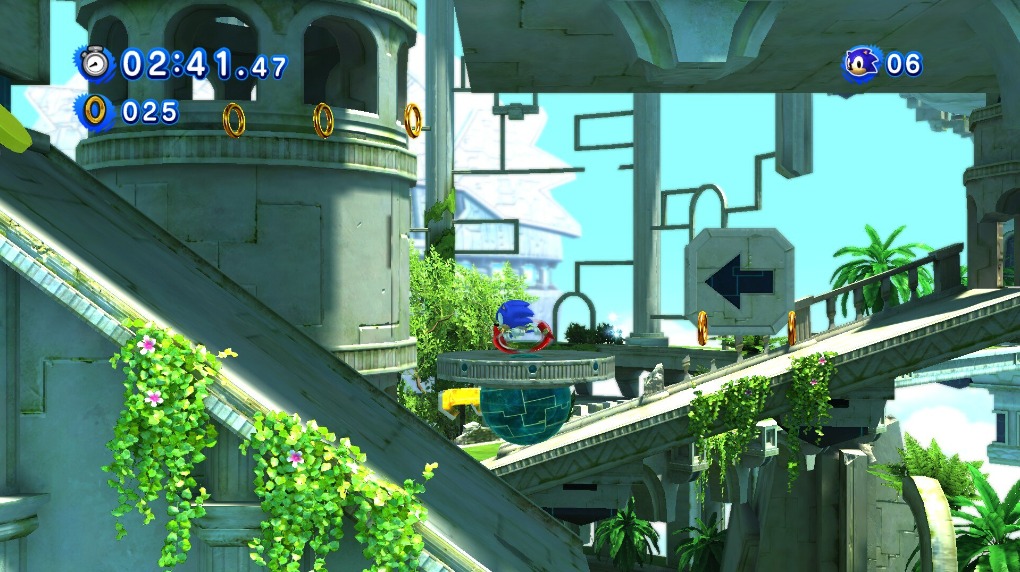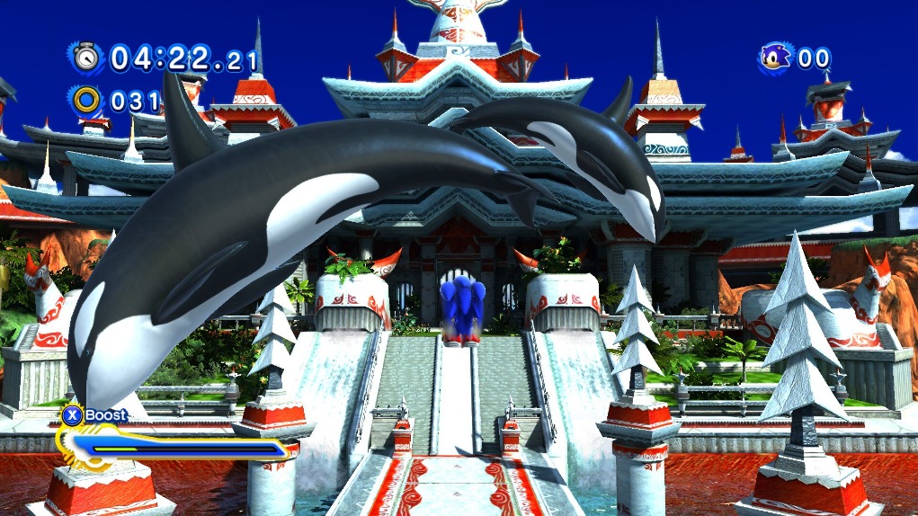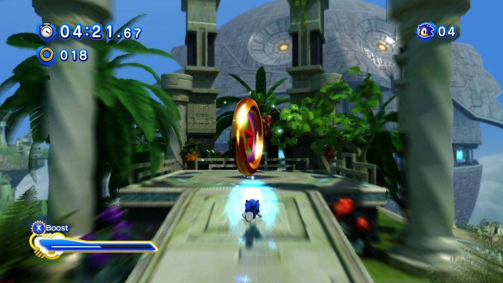 Act One of each level is the classic version, played by the smaller, less-experienced Sonic. Accurate to the time, Classic Sonic can charge up a spin-dash, but that’s about it; there’s no boost or homing attacks to be found, and while the environments Sonic moves through are rendered in beautiful 3D, Sonic can only move on a predetermined 2D plane. Act Two hands the reins to Modern Sonic, who explores equally visually-stunning 3D levels with a greater amount of control, the ability to boost through enemies and obstacles alike, and a reliable homing attack that can be used to destroy foes – often while using them to cross a gap or reach new areas – and also lock on to interactable targets in the environment, like springs or pulleys. Because of this, Classic Sonic’s levels are easier in general, but during extended play sessions, it is a practically a guarantee that at some point, you will forget which Sonic you are controlling, and try to boost or launch a homing attack as Classic Sonic to no avail, or try to charge up a spin-dash as Modern Sonic and end up boosting yourself directly into a pit.