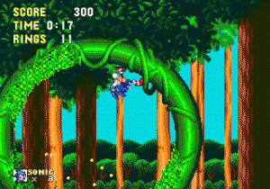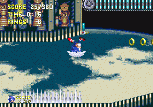 A few other changes and additions have been made as well. There are now two new bonus round minigames for when you pass by checkpoints. In one, you need to climb a vertical tower by attaching yourself to glowing orbs and then flinging yourself off. These are fairly hard, since there’s also a barrier climbing from the bottom of the screen, very quickly, and it’s hard to make progress until you get the hanging of the way the orbs work. The other is more straightforward, a combination of the rotating gem mazes from Sonic 1 with the slot machines from the Casino Night Zone of Sonic 2. A few music tracks have been changed, including a new miniboss theme and a different theme for Knuckles, which replaces his own scratchy, percussion-based tune.