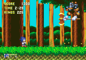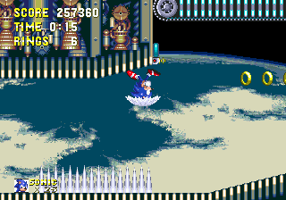 But the biggest addition, as the game’s title implies, is the ability to play as Knuckles, including in the Sonic 3 levels. He plays similarly to Sonic, but he can destroy certain bricks, can glide in mid-air, and climb most walls. However, he can’t use any of the shield’s special abilities, and he can’t jump as high either. This different skillset often send him through different parts of the levels, and also makes the boss fights a little different, in some cases making them harder. For example, in Angel Island Zone Act 1, he’s railroaded to a different part of the level, and while the boss is basically the same as Sonic and Tails, it has some extra attacks that make it a little more difficult. In Hydrocity Zone Act 1, the boss is the same, but since Knuckles can’t jump high enough to leap over the enemy, you need to be more creative in order to dodge it. Some bosses are removed, too.
