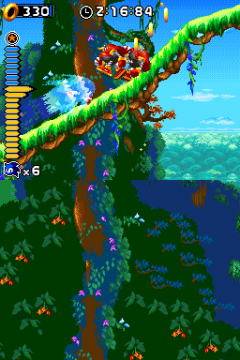 Gameplay’s the standard 2D platforming affair, emphasizing speed as you try to reach the end of the level. You can pull off mid-air dashes again with the R button, even after a standard jump. Blaze can’t run as fast as Sonic, but her aerial dashes reach up to higher areas and holding R after jumping lets her slowly descend to the ground. New to Rush is the ability to perform tricks in the air by pressing B and while grinding by pressing R, which gives you extra points and fills up the Tension Gauge.