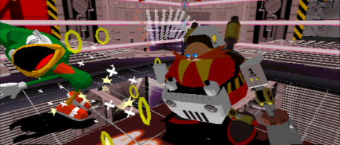 There’s eight playable characters gathered from across the franchise. Besides the blue hedgehog himself, you have the usual standbys of Tails and Knuckles. Amy, debuting in Sonic CD, makes her first playable appearance outside of a car, wielding her “Piko Piko Hammer” she’d carry with her into future games. Deeper cuts include Fang (“Nack” in Western territories), the popgun-wielding gerboa from Game Gear’s Triple Trouble, as well as the ninja chameleon Espio, from 32X’s Knuckles’ Chaotix. Two brand new characters round out the cast: Bean is a bomb-tossing duck inspired by Bin & Pin, the heroes from past Sega brawler Dynamite Dux. Finally, Bark is a heavyset polar bear who lacks the speed of most of the cast, but excels in dealing big damage.