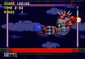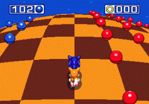 There are two types of bonus levels now. When hitting a checkpoint post with enough rings, you’ll enter a sort of gumball machine, where you can bounce off the walls and get power-ups. Hidden throughout the levels are also gigantic rings, which look similar to the end level ones from the first game. These bring you to a different bonus stage called Blue Spheres, presented from an over-the-shoulder perspective and taking place on a huge checkered globe. Here, you can only turn in 90 degree angles, as the perspective shifts but the player stays facing forward at the bottom of the screen. The goal is to touch all of the blue spheres and turn them red. Touch any of the red spheres (including any of the ones already present on the map) and you’ll be kicked out. If you trace a circle around the edge of any grouping of spheres, you’ll turn them all into rings, which grant extra points and lives. The more spheres you get, the faster the game moves, until you’re making turns with split-second accuracy and the whole world is spinning around at a dizzying pace. They’re incredibly difficult, though a bit easier to manage that the courses from Sonic 2. As with before, beating one of these will grant you a Chaos Emerald; get all of them and you can turn into Super Sonic.