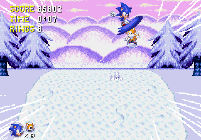 Sonic has a new power-up: a snowboard that allows him to cruise down the snowy mountains of Robotnik Winter. Not wanting to be outdone, Tails gets one too: the High Speed Helitail, which functions in the same way as Sonic’s Rocket Shoes. Tails can also use the Sea Fox, a submarine that allows him to more easily explore the depths of Tidal Plant. Both characters have gained the ability to curl into a ball when launched from a spring or recovering from a hit, which makes the gameplay a bit more dynamic than before.
