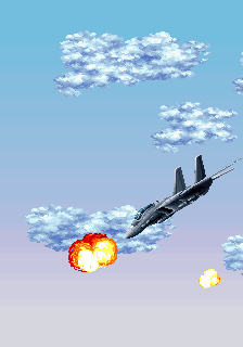 Two USAF pilots, Keaton and Keith fly the F-18 Hornet and F-14 Tomcat, respectively. Keith’s red plane moves a bit quicker than Keaton’s. Keith’s weapon is a straight pulse that increases in width as it powers up, and his bomb attack is a swarm of bombs pelting the ground. Keaton’s weapon is similar to Keith’s, and his bomb is a single tactical nuke.
