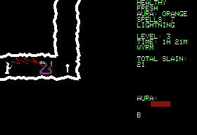 The big problem with the huge extent of the dunjon lies in the unability to save the game, which Sorcerer of Sivashares with the much shorter episodes. To make things really frustrating, the corridors are full of trap doors that send you back to even below the starting position, no matter how far you’ve proceeded in the game. Those trap doors can’t be found with the search for traps command, making exhaustive trial&error and minute map making the only means to figure out the labyrinth. As if all that wasn’t enough frustration, the exit of the mines gets locked up after a certain amount of time, leaving players trapped in the mines, with their score presented at their death as the only solace.