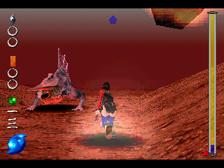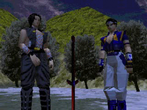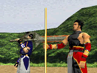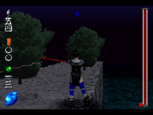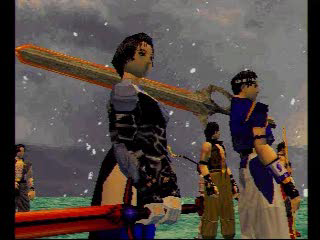 Square put an incredible effort towards the presentation and story of Soukaigi. Though it has three CDs, most of this space is taken up by cutscenes, as the game takes only a few hours to complete. These FMVs are rendered using the in-game 3D engine, so they look fairly poor in contrast to other Square games like Final Fantasy VII or Parasite Eve. On the other hand, unlike these games, it is fully voice acted. The in-game 3D is pretty ropey looking, with glitchy camera movement and plenty of fog, but it does add to the otherworldly, mystical atmosphere.