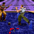 Space Harrier saw a remake on the PlayStation 2 under the Sega Ages 2500 series. The entire game has been redone with polygons, but the whole makeover looks rather cheap, with jaggy visuals and low resolution textures. The redesigned look of the Harrier is lousy, with his silly goggles and spiky blond hair. The graphics lose much of the bright color that made the original so attractive, but since the objects here are actual 3D objects instead of 2D sprites, it gives a better impression of depth and scale. In the original game, all of the boss dragons were made out of individual segments that scrolled in unison, giving the illusion of a flying beast. Here, they actually look like dragons. There’s no option for analog control, sadly.