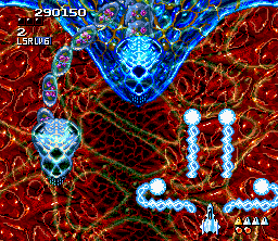 On the default setting, the game isn’t too hard. The slow pace means you can saunter around most things, and your weapons can easily overwhelm almost everything if they’re sufficiently powered up. Getting hit knocks you down a few weapon levels, so if you’re strong enough you can take two direct hits before getting killed. It re-uses the Blazing Lazers-style of resurrection, where you’re granted “gold“ ships that allow you resume immediately where you left off, but need to restart from a checkpoint if you run out.