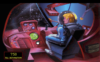 The first Space Quest episode begins with our hero, Roger Wilco, taking a nap on the closet. This act of severe laziness ends up saving his hide, as the rest of the entire active crew of his spaceship, the Arcada, has been killed by the Sariens, who have invaded the ship and stolen the powerful Star Generator. After sneaking out and hijacking an escape pod, Roger ends up on the desert planet Kerona, where he must evade numerous dangerous creatures, including a spider-like robot sent by the Sariens. Upon discovering a Wizard of Oz-like scientist who lives under the surface, Roger takes his speeder to Ulence Flats (reverse those two words for an almost-clever gag), one of the only establishments on the planet. After winning it big at the Slots of Death (getting triple skulls results in being vaporized) and overhearing the location of the Sariens, Roger affords himself the luxury of a navigational robot and spaceship, and heads off to disable the Star Generator himself.