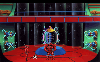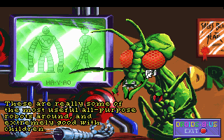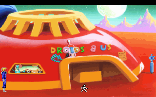Most of the humor comes from references to pop culture and other sci-fi series. The bar in Ulence Flats features alien versions of the Blues Brothers and ZZ Top, although the latter was changed in the VGA version due to a complaint from the musicians themselves. The EGA version features PC speaker renditions of the Blues Brother’s theme and ZZ Top’s “Sharp Dressed Man”, while the VGA version features different but similarly styled pieces of music. When shopping for robots in the VGA version, you’ll find a number of classics, including the Robot from Lost in Space, Robby the Robot from The Forbidden Planet, and a creature that looked like it stepped out of Laputa: Castle in the Sky called Hay-A-O, a reference to the film’s director, Hayao Miyazaki. The arms dealer on the Sarien ship also sounds suspiciously like Marvin the Paranoid Android from Douglas Adam’s The Hitchhiker’s Guide to the Galaxy series. The robot shop itself was named Droids R Us in the EGA version, but changed to Droids B Us in both future revisions and the VGA version due to a lawsuit from the toy retailer. Strangely, the VGA version goes one step further and features a green giraffe that looks suspiciously like Jeffrey, the Toys “R” Us mascot.