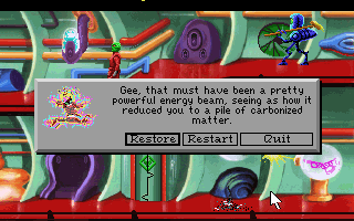Or… not. Sierra games are known to be particularly punishing to the player, especially when it comes to death scenes. Space Quest takes this and runs with it, with a number of amusingly sardonic ways for Roger to die. At least if you do something wrong, it tends to garner a chuckle. The narrator is often the most amusing “character”, offering sarcastic commentary on Roger’s every action.