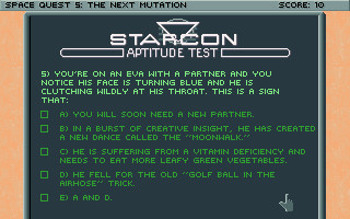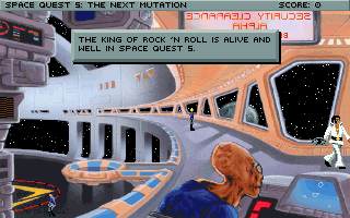The whole game is obviously a pretty huge Star Trek parody, mostly because The Next Generation was popular at the time. The first task is to pass the academy final exam (which Roger hasn’t studied a bit for, of course) and some of the multiple choice questions are quite chuckle-worthy, even if it’s not as hilarious as the bargain bin from Space Quest IV. If you wander through the halls of the academy long enough, you can find Obi-Wan and Darth Vader dueling in the distance. If you pay attention to various screens, you can find animated versions of classic arcade games like Missile Command and Pong. It also features some outdated references to telecommunications company Sprint, who sponsored the game. You overhear some guards talking about switching telephone plans, and all communications aboard the ship end with the Sprint logo. At one point, Roger is transformed into a fly in order to infiltrate an office, and in another, he hops into the seat of a 2001-style EVA pod to rescue Cliffy, who has accidentally fallen out into space.