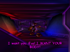 On the station, however, oblivious to the Earth government’s plans, a forbidden special kind of love is forming between a robot dog named Roger, and a robot sheep named Flossy. It breaks all the social and evolutionary conventions, and yet it feels so right. After Flossy requites his affections, Roger the dog does a little of dance of happiness, because yes, she does indeed love him too. And then Roger is crushed by Dan Danger’s enormous space ship. “ROGER! NOOO!” screams Flossy, but all the woolly tears in the universe can’t re-animate his dead body (or can they?). For you see, unfortunately, en route to the space station, Dan was busy fiddling with his intergalactic radio rather than watching where he was flying, and so promptly crashed right into it. EVO ends up ejected and smashed into pieces, while his control chip lands in the body of Roger, thereby possessing him (because all the animals on the station are robots). Flossy runs in fear! Roger the possessed dog chases after her, bites her to death, and then places her body near the exhaust of the crashed ship to be burned by fire! Suddenly a golden souvenir appears!