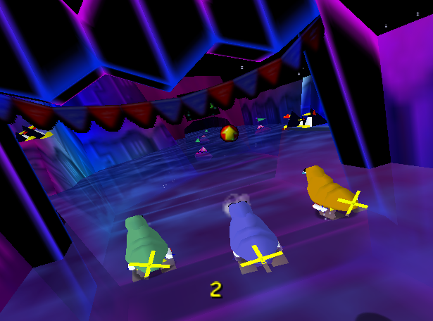 An early level will see you using a dog to herd sheep into a pen, using the sheep to float across islands, while in a later level that same dog is used to kill rocket foxes while the sheep grow carrots in a field to be used as platforms. In the Ice Zone a penguin will play music on an enormous piano in one level, or hunt down polar bears in another. What about a hyena playing a game of Frogger on some jungle logs, or a purple gorilla swinging from vines in a similar environment? Quite a few mission objectives are your standard “become this animal” variety, but the majority are extremely inventive and clever, possessing more creativity in a couple of levels than some developers will manage in an entire series of games. There are also no traditional boss levels, and instead the end of each zone features something special. For the Europe Zone you’ve got an epic (and literal) dog fight, as a “dogplane” attacks a series of flying foxes. For the Ice Zone it’s a walrus race called, yes you guessed it, Walrus Race 64. In the Jungle Zone it’s an on-rails first-person shooter, using little arrows to take down animals. While the final one, in the Desert Zone, is a series of boxing matches, with a humorous twist.