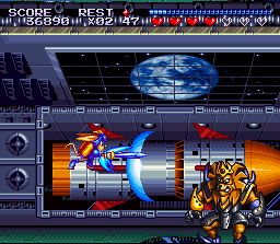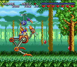 The levels themselves are more creative as well – there’s an Egyptian-themed level, a stage based around musical instruments, with gigantic pianos and trumpets that spew you into different parts of the level, and another has you jumping from mechanical birds. At the same time, they’re longer and a bit less involving – while there are still some mini-bosses here and there, the situation rush aspect is mostly gone. The levels are also filled with jewels which, in traditional platformer fashion, will award you an extra life when you grab 100 of them. The side-scrolling shooter sequences have been replaced with a single overhead shooter stage, which works a bit better than the original Rocket Knight Adventures.