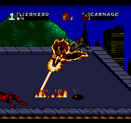 It also needs to be said that the game is hard, with no Options menu in sight to alleviate it, and you shouldn’t get into it expecting to finish it on your first few sessions. First you’ll need to find the extra lives and credits strewn around each major stage. Boss battles are numerous, and they usually put you at a numerical disadvantage. It’s not so bad at first, but in the latter levels, you’ll often have to fight off the whole team, two-by-two, while they get stronger with each appearance: Shriek, Doppelganger, the irritating Demogoblin, the even more irritating Carrion, and finally Carnage himself. By that point, it becomes essential that you make an effort to find as many of the superhero icons as possible and ration out their use intelligently. Each icon summons its corresponding hero for a few seconds to execute attacks of differing properties. Firestar is great against Carnage, for example, while Cloak and Dagger are better at clearing up a screen of minor enemies, Deathlok’s guns can reach Demogoblin, and Iron Fist can either heal you or kick enemies around. These icons start to show up around the middle of the game and can be accumulated throughout the levels; sometimes you may need to shuffle through them (with L and R on the Snes or Start/X on the Genesis) in order for them to show. Other cameos include short-lived Spawn ripoff Nightwatch, Felicia Hardy, Morbius and Captain America.
