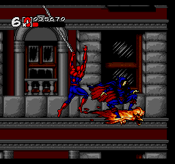Despite featuring two main characters, however, it’s strictly single-player, a decision that limited its appeal for many. It might have to do with its adherence to the source material, as Venom only becomes selectable after he’s introduced in the story a few levels in. This approach also influences the basic game structure, as it alternates between levels of varying lengths and repeated boss battles against Carnage’s allies that mostly serve to advance the plot. This, along with a climbing level in which you must scale a brick wall while avoiding thunder bolts, creates a breezy, varied experience that sidesteps the monotony plaguing many beat-’em-ups.